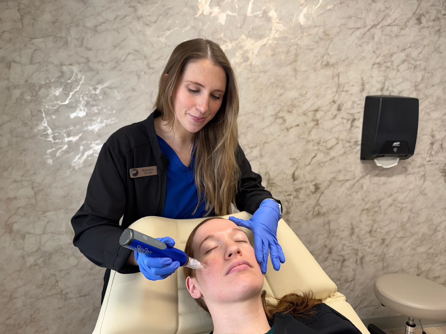 First, we will apply a topical numbing cream to the skin. Then, we will use one of our microneedling devices to go over the affected area. The device uses small needles to penetrate and break up the epidermis. One session can be as short as 15 minutes!